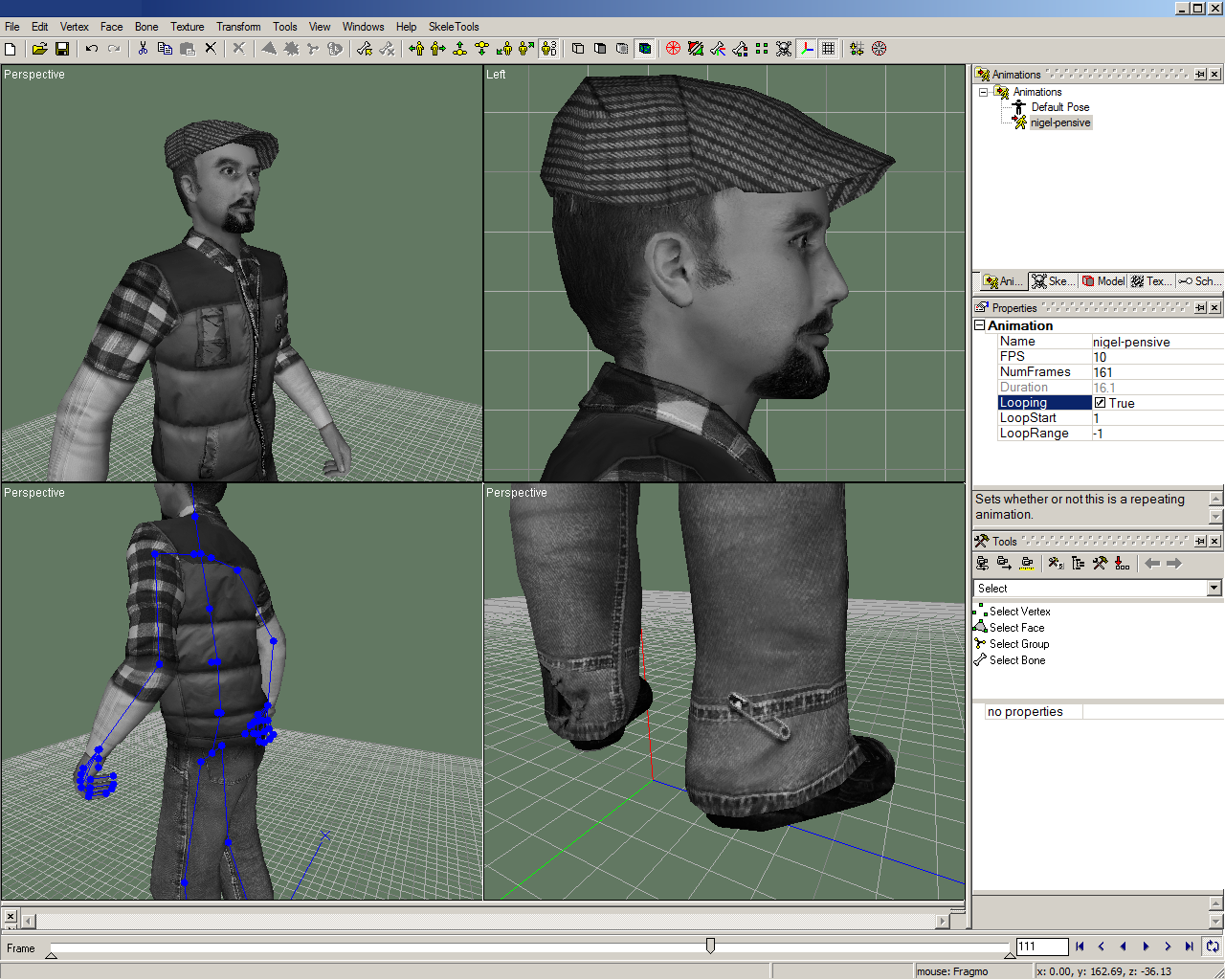 Working on Nigel, specially smaller details, like his safety pins, flat cap and beard. He's not exactly an action hero, no no no, but he is a lot more 'active' in the sequel and part three. He just moves better, and looks more 'alive'. Bit skinnier too. Perhaps Mrs.Slaughter has stopped serving those greasy slices of pizza. Mind you, Nigel never actually ate anything in-game. He fed it all to Cairan, the pig! So, with a pinch of a vertex here, the addition of a polygon there, the new Nigel is ready for action. In several outfits.